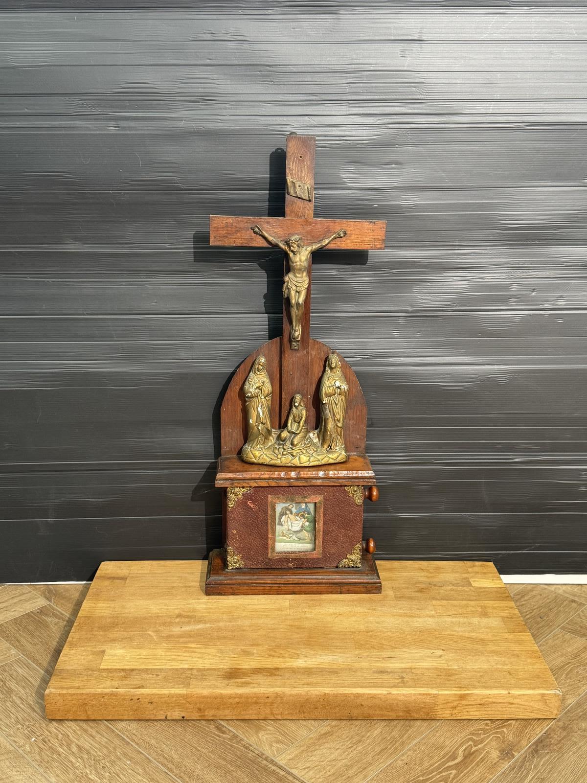 Rare Beautiful crucifix crafted by Koenig Bros in 1904 features intricate scroll work with 14 images of the crucifixion operated by two handles to the side. Gilded metal of Christ and three gilded plaster figures with some damage as shown.