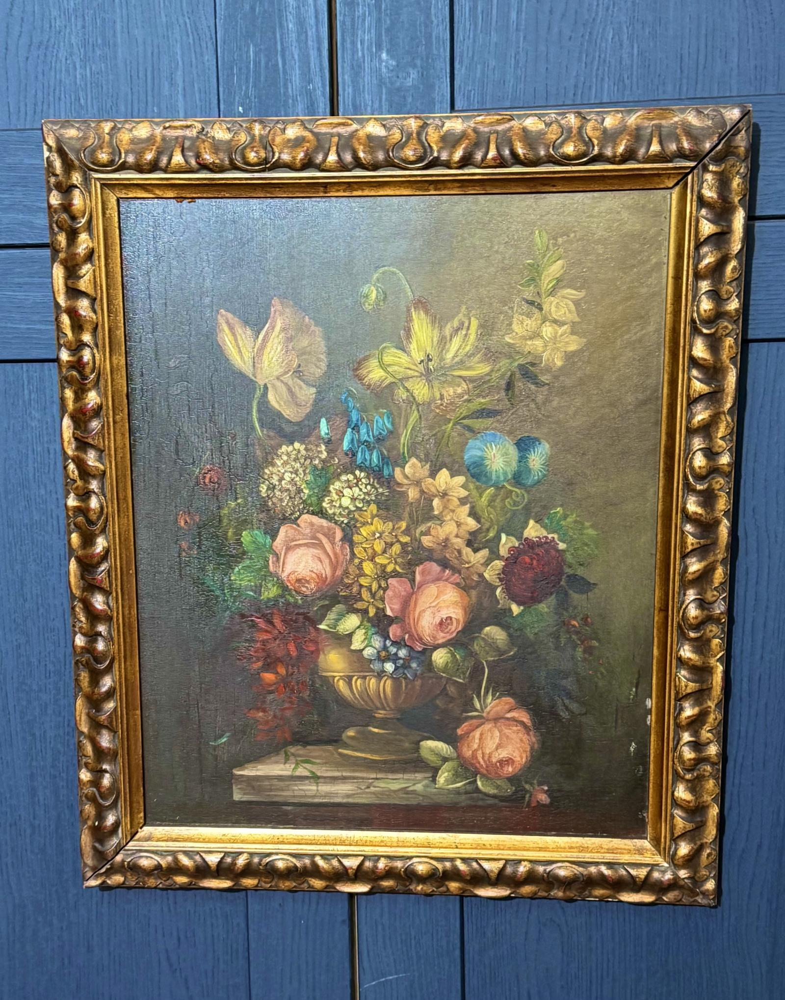 19th Century still life oil on board that is all original with signs of wear and some flecks of blue paint detected under a UV light. Could do with a light clean if desired but a good quality original painting in a gilded wood frame.