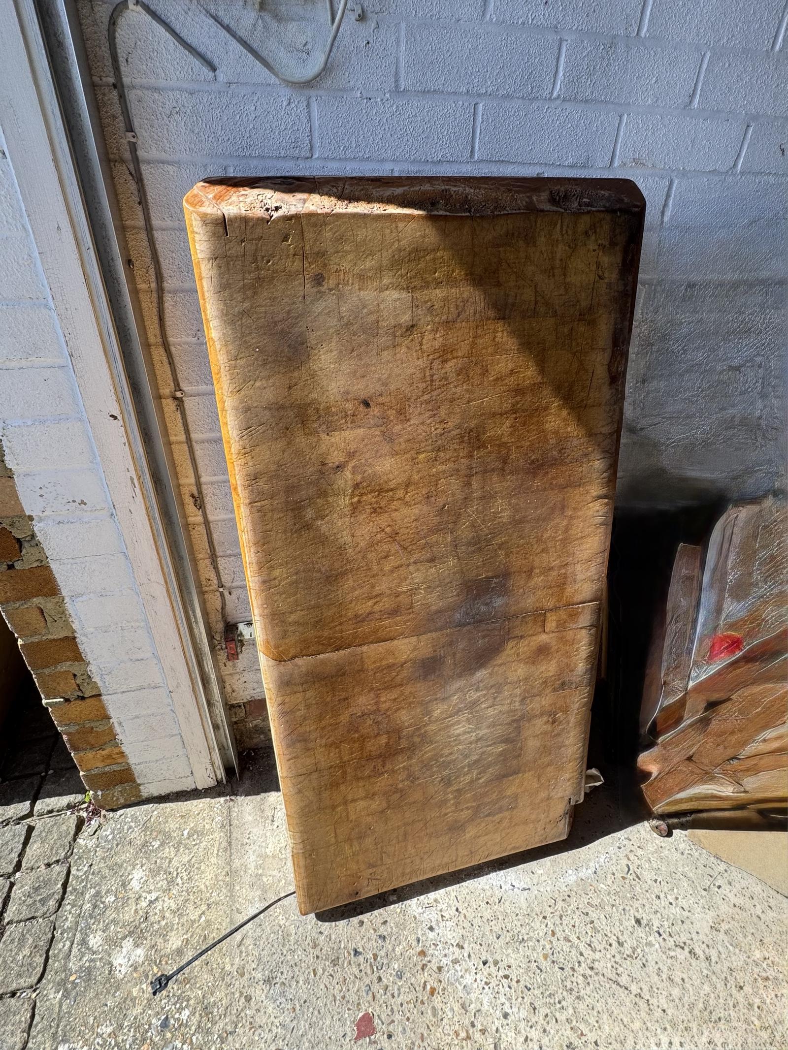 This antique butcher's block dates to the early 20th century and is constructed from solid hardwood. The surface shows signs of use consistent with its age, including wear and markings indicative of its functional history. The block is designed for food preparation, specifically for butchering and chopping meat.