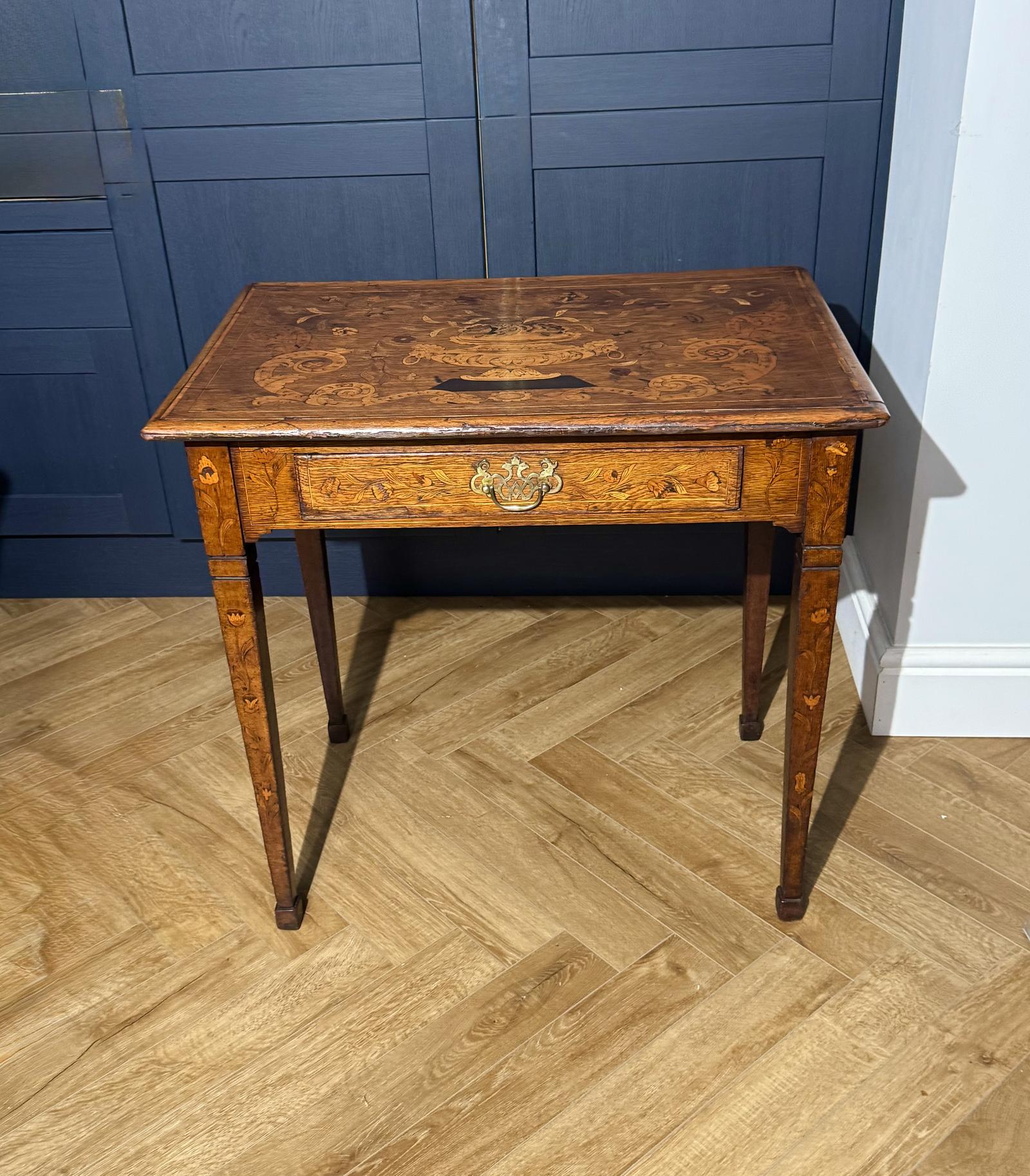 Antique Dutch side table covered in marquetry with square legs and one drawer. There are pieces of marquetry and age related wear and tear