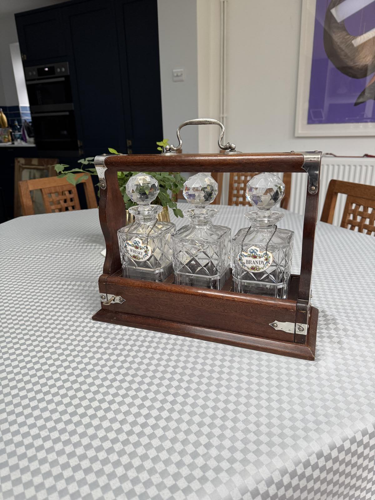 19th Century antique mahogany Tantalus set with three perfect cut glass decanters and stoppers, the tantalus is in good condition but has age related wear. Brandy and whiskey labels by Crown Staffordshire and the lock works.