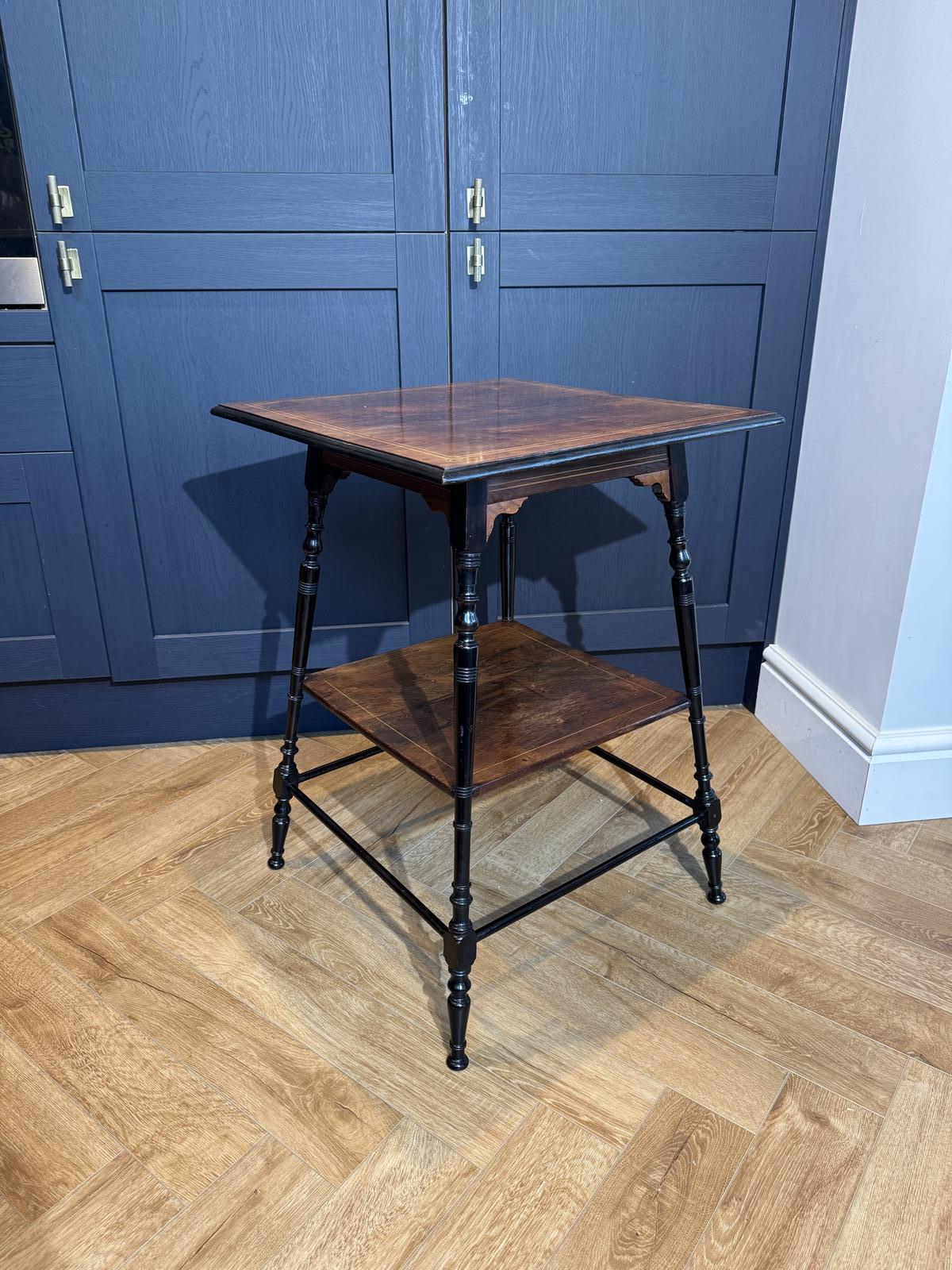 This is an Arts & Crafts table made of rosewood with inlay and ebonised frame. It was approximately created in 1890. The table features a design characteristic of the Arts and Crafts movement, highlighting craftsmanship and the use of natural materials and in good condition with age related wear.
