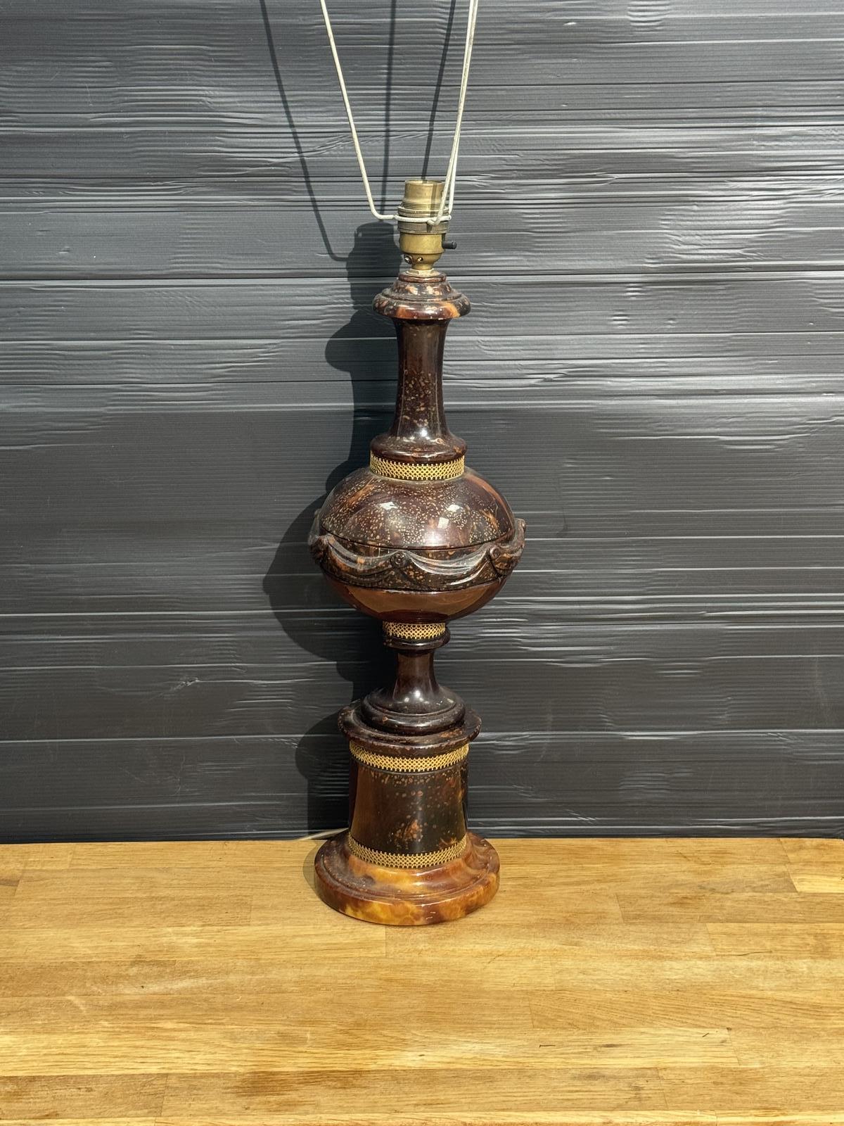 Heavy quality alabaster lamp with four gold mesh bands encompassing the lamp. Made of carved alabaster and in good condition