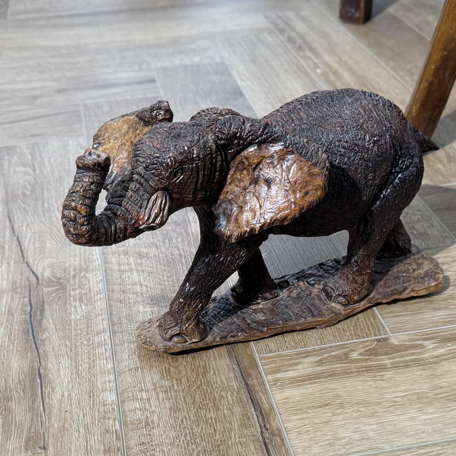 Carved hardwood elephant without tusks, I don't think this carving ever had tusks. This is carved out of one piece of hardwood and that includes the base.