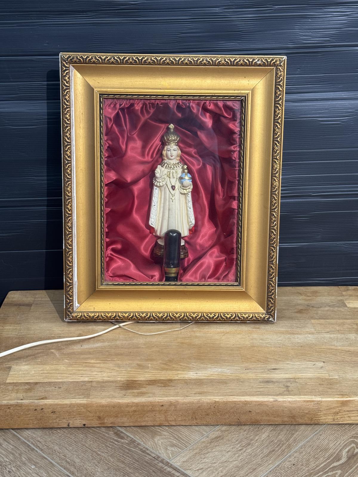 This is a Religious or Royal figure in a picture display case. There is a red bulb at the base to light up the case, but it will need the wiring updating. There is some wear to the right of the frame.