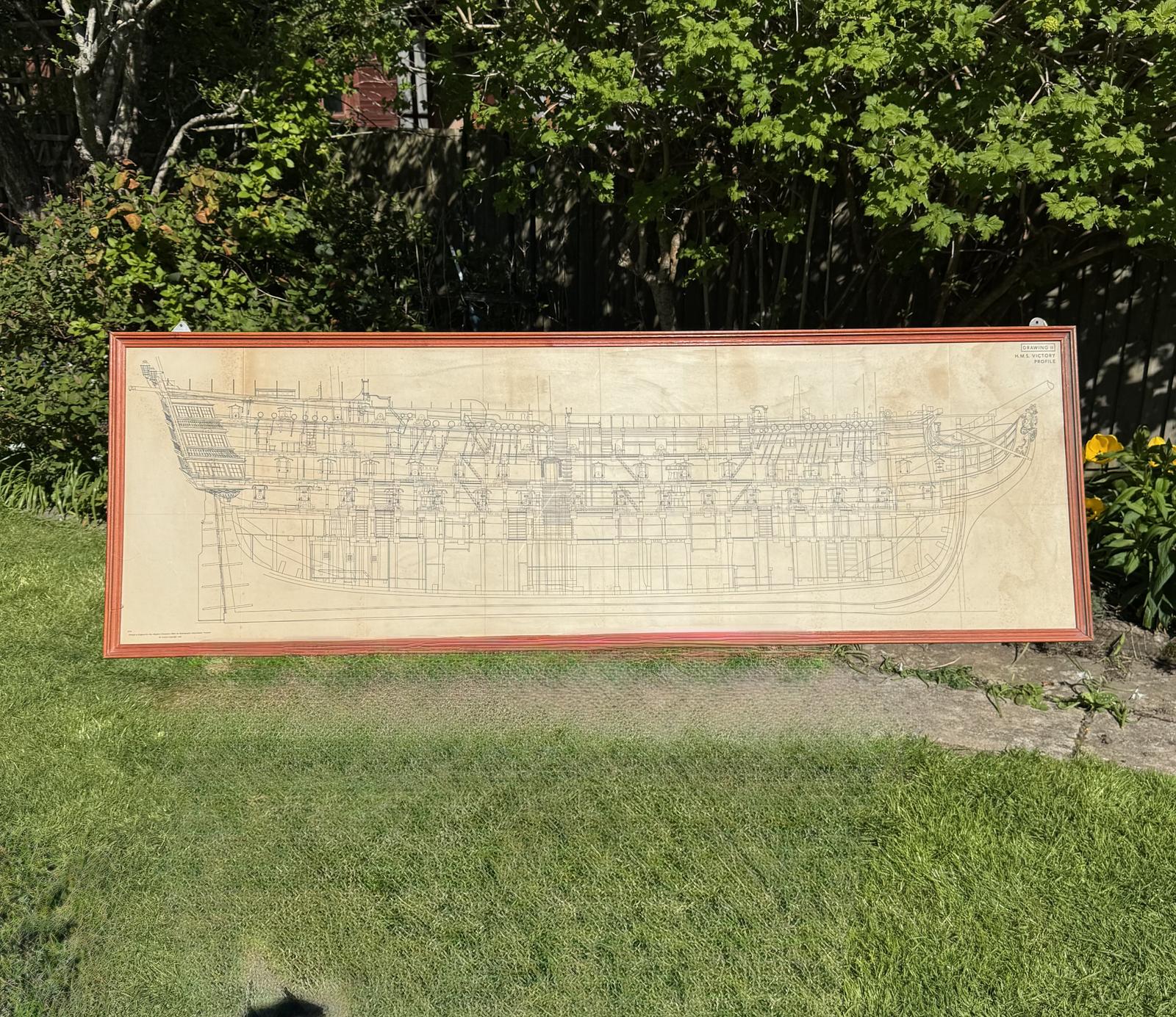This item is a large print of HMS Victory, created approximately in 1966. The print features a detailed cross-section of the famous warship. Presented in a wooden frame with some marks as shown in the photos