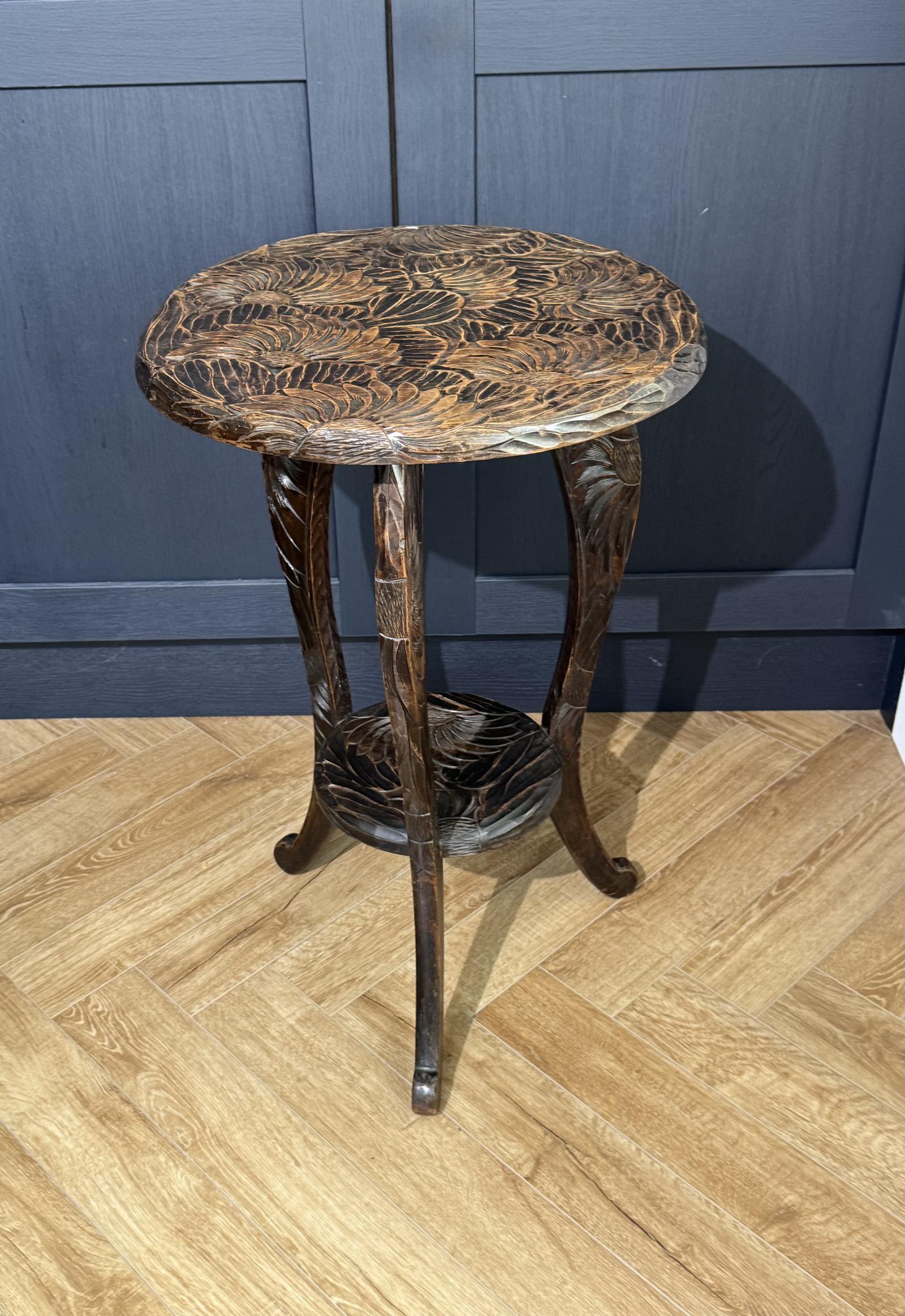 Carved leaf two tier hardwood table in the style of Liberty's Japanese furniture from the early part of the 20th century. Dark in colour.