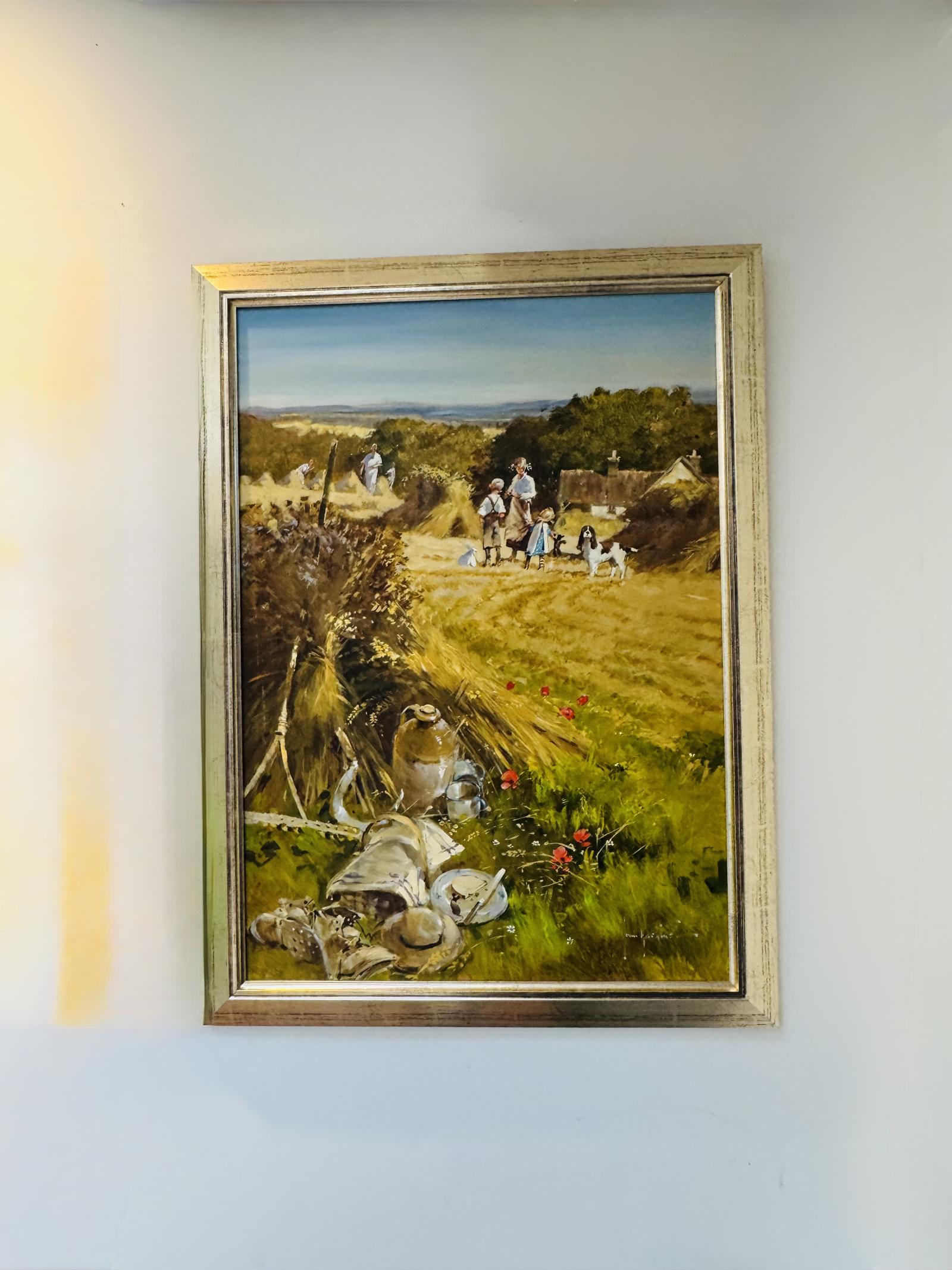 English countryside scene "Haymaking" oil on board by John Haskins and signed bottom right. Provenance from Canterbury auction galleries, Canterbury, 11th August 2015, lot 265. Presented in a gold frame.