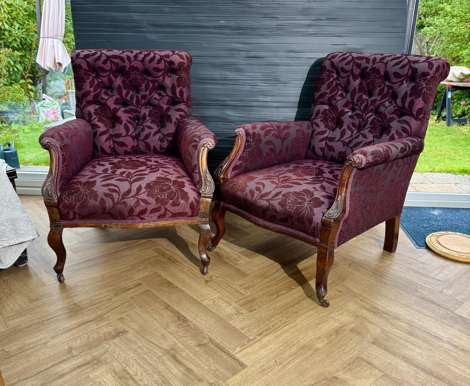 Pair of 19th century carved mahogany salon chairs with very good embossed purple velvet upholstery with no stains or wear. Both have brass castors on the front legs.