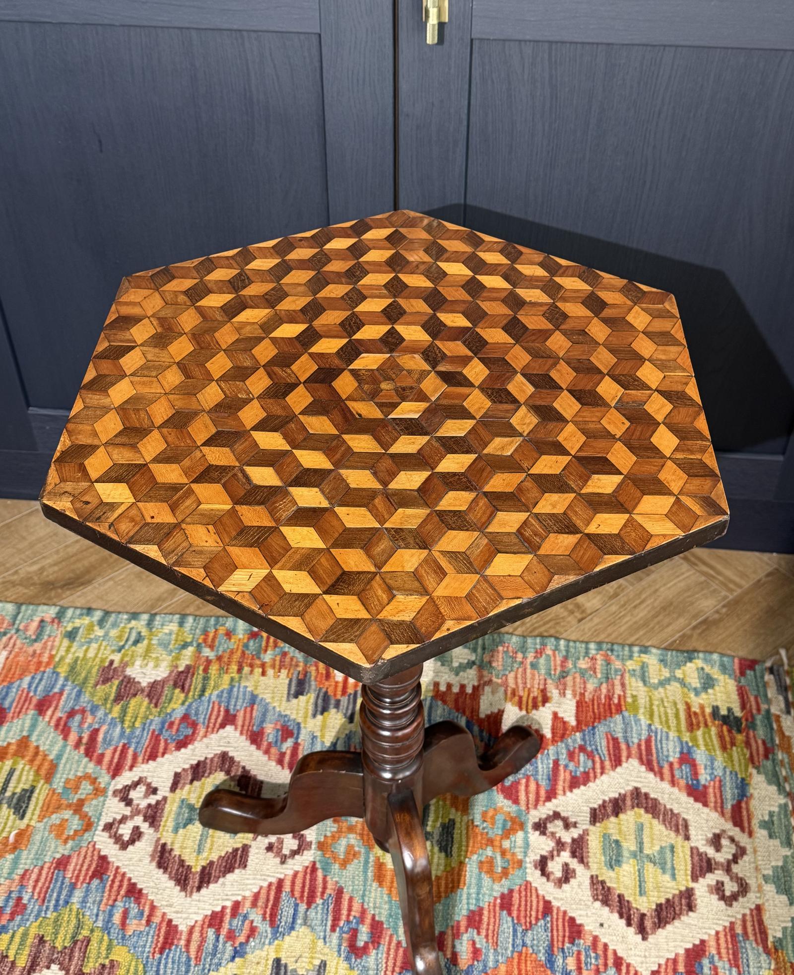 Stunning Victorian mahogany table with a hexagonal top with a superb geometric inlay consisting of a variety of specimen timbers.